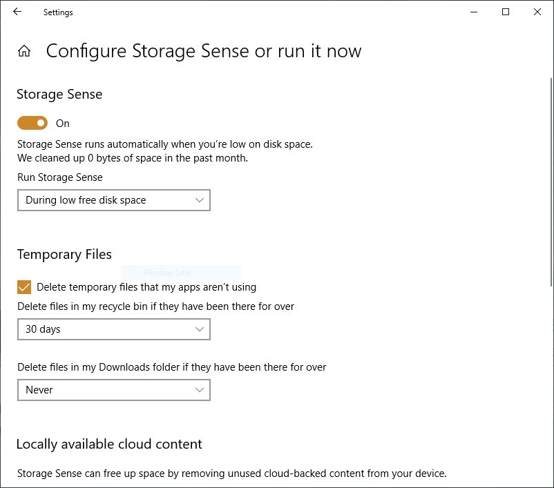 You can customize how Storage Sense works and also use it to free up even more space than it normally would. Underneath Storage Sense, click “Configure Storage Sense or run it now.” From the screen that appears, you can change how often Storage Sense deletes files (every day, every week, every month or when your storage space gets low).